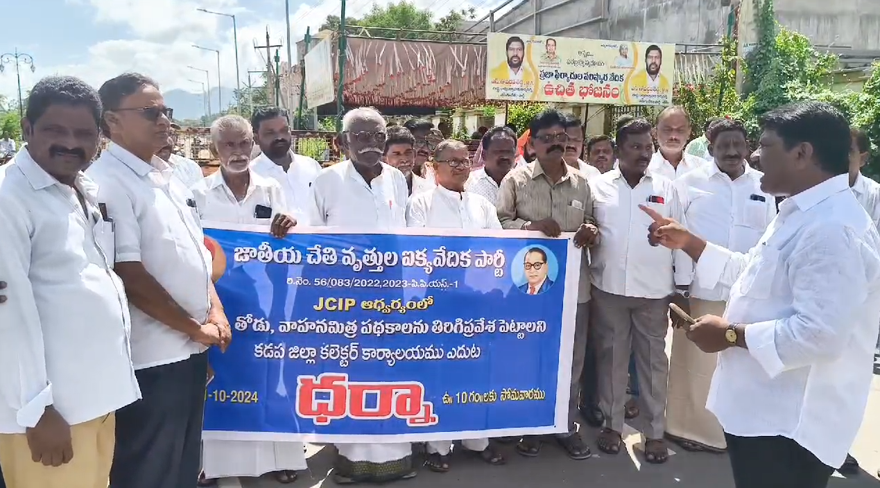 Kadapa – Andhra Pradesh: Leaders and activists from various organizations gathered in Kadapa to demand the immediate restoration of key government schemes for artisans, including Todu, Chedodu, and Vahanamitra. The protest, organized under the leadership of Avvaru Mallikarjuna, was held at the new Collectorate, calling for renewed government support for the handicraft sector. Founder of Mahajana Rajyam Party (MRP), Sangati Manohar, expressed solidarity with the cause and urged the government to reinstate these essential programs.