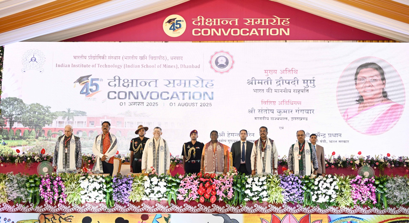 Jharkhand: President Droupadi Murmu addressed the 45th convocation of IIT (ISM) Dhanbad today, emphasizing the need for innovation aligned with public welfare and environmental harmony, and urging students to combine intelligence with empathy, excellence, and ethics.