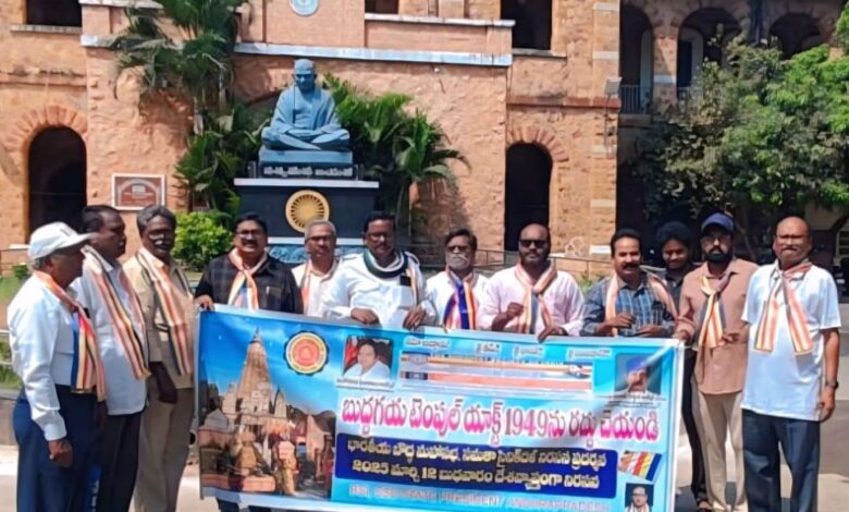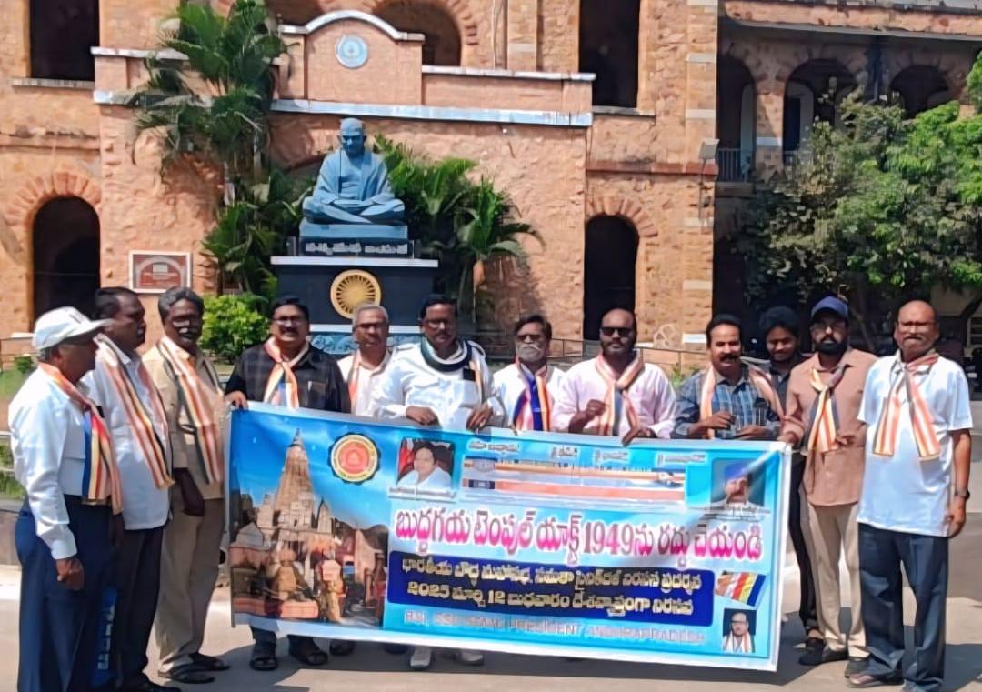 Eluru – Andhra Pradesh: The Indian Buddhist Mahasabha staged a protest at the Eluru Collectorate on Wednesday as part of a nationwide movement demanding that the Mahabodhi Temple in Bodh Gaya be handed over to Buddhist monks. The protestors, led by the Andhra Pradesh branch of the Buddhist Society of India (BSI), submitted a memorandum to the District Collector urging Bihar Chief Minister Nitish Kumar to repeal the 1949 Bodh Gaya Temple Management Act.