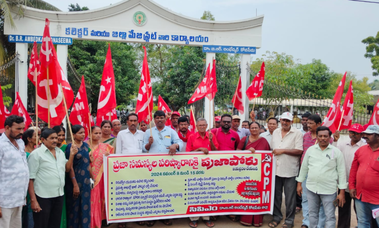 Amalapuram – Andhra Pradesh: In a powerful protest at the Amalapuram District Collector’s Office on Thursday, the CPI(M) led a public demonstration addressing the soaring prices of essential commodities, employment issues, local infrastructural needs, and the failures of coalition governments to fulfill election promises. CPI(M) leaders called for immediate government action on these issues, advocating for fair prices, job opportunities, and essential resources to ease the burdens on citizens.