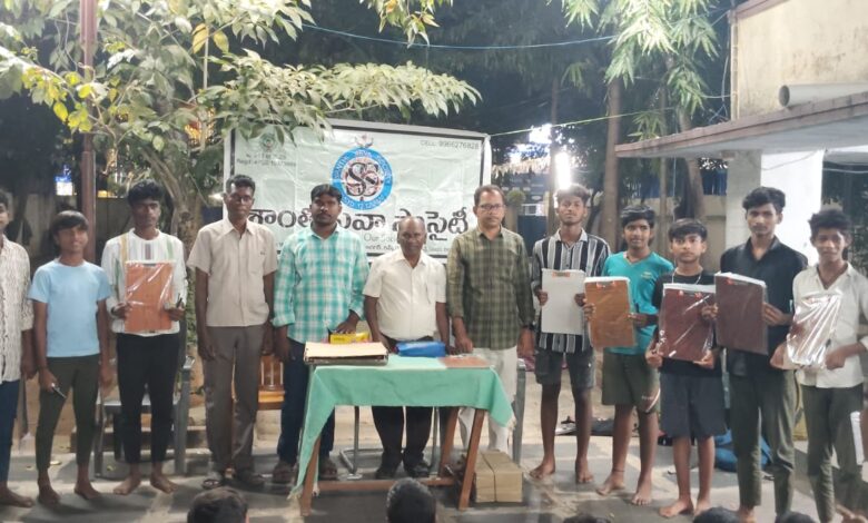 Under the auspices of Shanti Seva Society, students studying in areas such as Shankarapuram, Prakash Nagar, and the SC Hostel in Kadapa received free exam materials including pens, pads, pencils, and erasers.