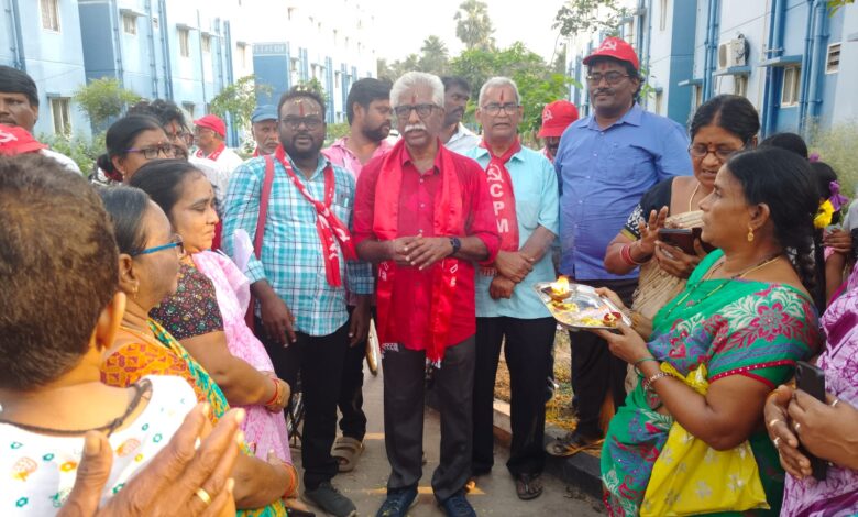 In Amalapuram’s Chandrababu colony, the yatra uncovered a land dispute where women allottees accused encroacher Degala Veera Babu of seizing their plots with fake documents. Despite appeals to revenue and police officials, no action was taken. During the inspection, Veera Babu allegedly attempted to attack the CPM team and the women, but fled after party leaders intervened. Srinivasa Rao promised legal support to fight the illegal constructions, earning praise from colony residents.