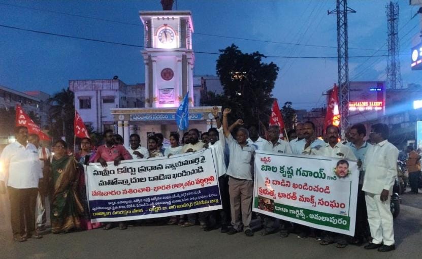 A protest was organized at the Clock Tower Centre in Amalapuram on Wednesday evening under the aegis of Dalit, public, student, women, worker, teacher, and employee unions. The participants expressed deep concern over the incident, stating that the attack had brought shame to the entire nation.