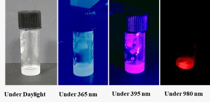 The ink displays various colours when exposed to specific light wavelengths: vibrant blue under 365 nm light, pink under 395 nm, and orange-red under 980 nm near-infrared (NIR) light. Unlike traditional UV-only covert tags, this multi-wavelength response offers enhanced protection against duplication.