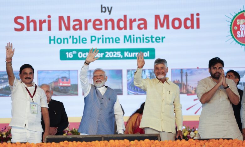 Kurnool – Andhra Pradesh: Prime Minister Narendra Modi on Thursday inaugurated and laid the foundation stone for multiple development projects worth around Rs 13,430 crore in Kurnool, marking a major push for industrial, energy, and infrastructure growth across Andhra Pradesh. Addressing a massive gathering, he hailed the state’s potential in science, innovation, and technology, stressing that under the leadership of Chief Minister Nara Chandrababu Naidu and with full support from the Centre, “Andhra Pradesh is poised for a new era of development.”