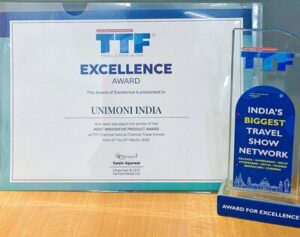 CHENNAI : Unimoni India was among the key exhibitors at the Travel & Tourism Fair (TTF) 2025 in Chennai, participating alongside Tamil Nadu Travel Mart at India’s largest travel trade show network. The event, held at the Chennai Trade Centre, brought together industry leaders, travel service providers, and tourism boards from across the country. During the event, Unimoni was presented with the Award of Excellence – Most Innovative Product, recognizing its contribution to the travel sector.