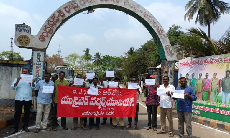Amalapuram – Andhra Pradesh: Members of the National Mazdoor Union and the United Workers Union staged a protest at the Amalapuram depot on Saturday, demanding an end to the alleged harassment of drivers by the depot manager. The unions also called for the revocation of an illegal suspension and better working conditions.