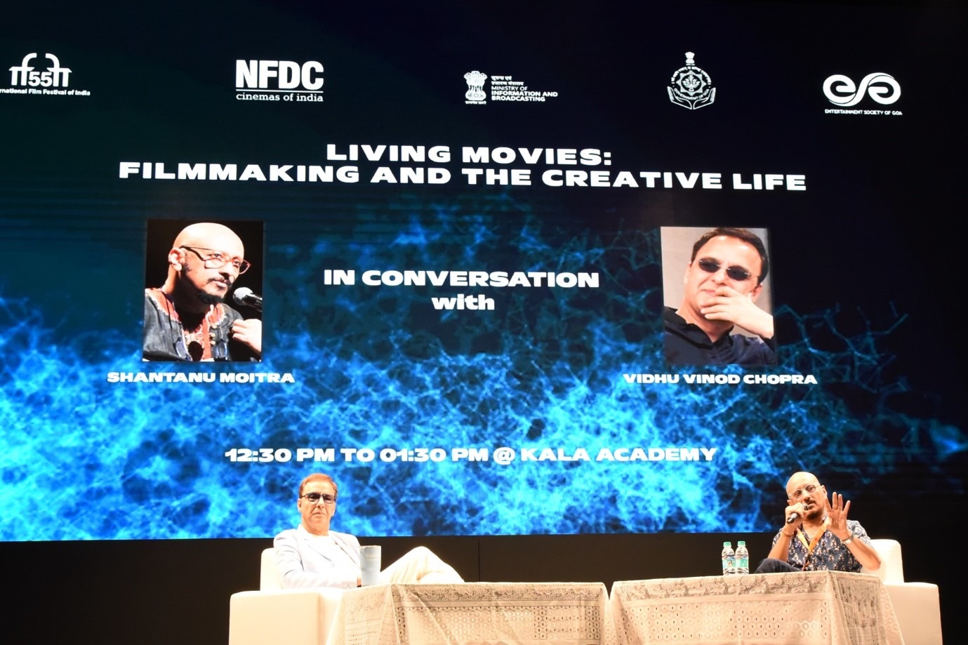 Panjim – Goa: Day 3 of the 55th International Film Festival of India (IFFI) in Panjim, Goa, witnessed a captivating masterclass titled Living Movies: Filmmaking and the Creative Life. Film director Vidhu Vinod Chopra and music director Shantanu Moitra enthralled the audience with anecdotes, music, and filmmaking philosophies at a packed Kala Academy.